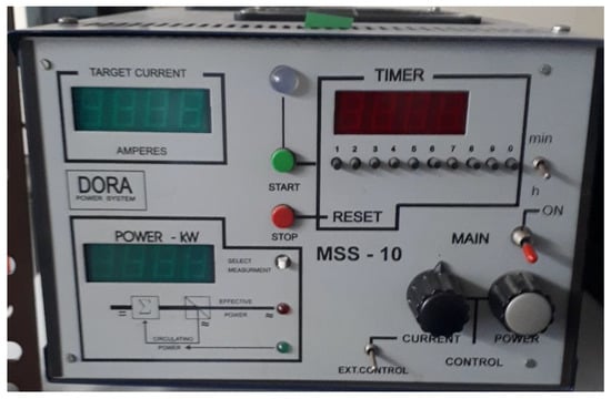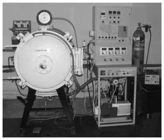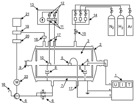 The process of cathode glow discharge nitriding is well characterised in many studies and scientific publications [,,,,,,,,,,]. The diagram of the analysis of the ion nitriding device is shown in Figure 2. Figure 3 shows the device for ion nitriding used in the research.