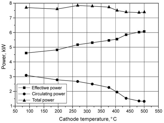 From the point of view of the correctness and efficiency of the nitriding process, the effective power—being part of the total power—is of particular importance. It is transferred to increase the energy of ions in the glow discharge process. The rest of the power (the so-called circulating power) is returned to the power supply. Measurements of power provided to the device for glow processing were performed in constant 15 min time intervals. Values of the total power, effective power and circulating power were read from an impulse electric power supply, i.e., Dora Power System MSS-10 (Dora, Wroclaw, Poland) (Figure 4). The total power provided to the device during the process was within the range 7.4 to 7.8 kW. The results of the authors’ own tests allowed them to conclude that the degree of power use of the power supply depends on the cathode temperature (Figure 5). It was found that, with increasing cathode temperature, the value of the circulating power decreases, while the effective power increases. It is combined with an increase in the degree of gas ionisation with increasing temperature.
