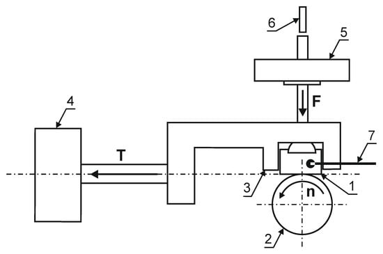 The diagram of a T-05 tester: (1) nitrided layer, (2) roll, (3) sample holder, (4) sensor for measuring the friction force, (5) load, (6) displacement sensor, (7) thermocouple.