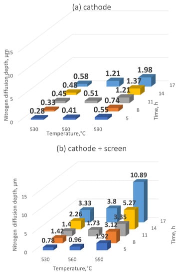 It can be assumed that the increase in the nitrogen diffusion depth is caused by a higher concentration of electrons inside the active screen, which increases the concentration of active plasma components in this area and the presence of molecular nitrogen that enables nitriding of the bottom of the sample directly adjacent to the cathode (Figure 9). In addition, the increase in the velocity of nitrogen ions that are implanted into the nitrided substrate leads to the creation of a non-equilibrium zone supersaturated with nitrogen, favouring a greater supply of nitrogen into the substrate. The above factors determine the higher growth rate of the nitrided layer in relation to cathodic nitriding []. Taking into account that the increase in temperature while maintaining a constant pressure will increase the free path of plasma active components, during the collisions of these components, they obtain greater kinetic energy, which contributes to greater plasma ionisation—and this affects the nitriding kinetics. It can therefore be concluded that, at higher temperatures, surface cathode sputtering is more effective.