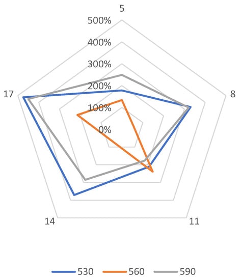 Percentage increase in the nitrogen diffusion depth of the material ion nitrided using the “active screen” method in relation to cathodic nitriding with different duration of the process (5 h, 8 h, 11 h, 14 h, 17 h).