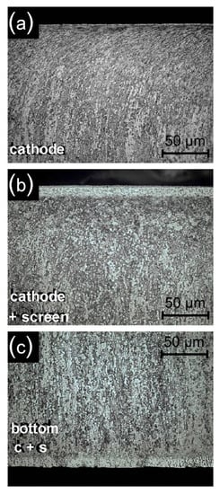 The microstructure of the nitrided layer on the substrate of Grade 5 titanium alloy for different variants of the samples’ distribution in the glow chamber: (a) cathode, (b) cathode + screen, (c) cathode + screen (with sample bottom). Process temperature T = 530 °C, time t = 17 h.