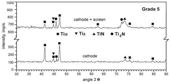 Based on the analysis of the phase composition of the layers formed on the substrate of Grade 5 titanium alloy, it can be stated that TiN and Ti2N nitrides are formed on the surface of the samples nitrided ionically on the cathode. The introduction of an active screen during nitriding on the cathode increases the nitride layer growth rate (a large number of intense TiN and Ti2N reflections occurs, Figure 11).