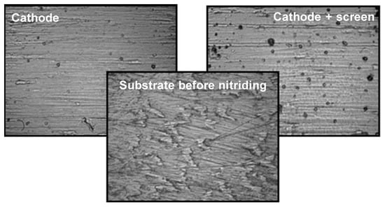 Similar phenomena occur also in the nitriding process without an active screen in the cathode drop area, in the near-surface area of the nitrided substrate. However, the concentration of ions present there is significantly lower than in the near-surface area of the substrate beyond the active screen due to the narrow width of this area [].