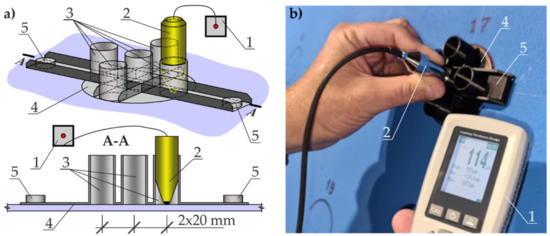 Test stand for measuring thickness of the paint coating by the electromagnetic method: (a) diagram of the measuring template; (b) view during the measurement taken on the sheet. 1—inductive thickness gauge; 2—measuring head of the thickness gauge; 3—head guides; 4—the measuring pattern; 5—neodymium magnets.