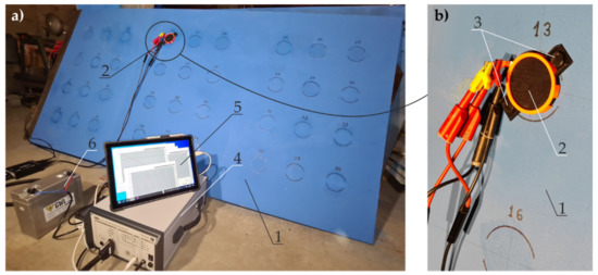 A stand for the EIS testing with a probe filled with gel electrolyte: (a) steel sheet with paint coating, the instrument, and the measuring head; (b) the measuring head. 1—test sheet of 2000 × 1000 mm surface area with blue coating; 2—measuring head; 3—neodymium magnets of the head; 4—high impedance analyser; 5—hybrid laptop; 6—battery.