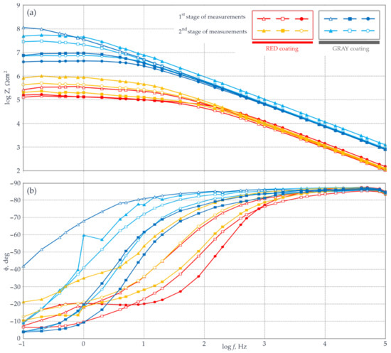 Data from measured impedance are presented on the Bode plots illustrated in Figure 8. On the diagram of modulus of impedance Z and measurement frequency f (Figure 8a), groups of spectra characteristics similar in shape for both tests sheets can be noticed. In case of the sheet with a thinner red layer, the logarithm of impedance modulus was within the range of 5–6 Ωcm2, whereas for the sheet with a thicker grey layer, the modulus was within a higher range of 6.7–8.1 Ωcm2. The assessment of protective properties of the test coatings based on Table 1 showed that the red coating had low barrier properties, and the grey coating had moderate ones. Observations based on the analysis of the plot in Figure 8a were also confirmed on the Bode plot (Figure 8b)—by the relationships between the angle of phase shift φ and the measurement frequency f.