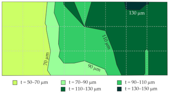 Figure 10 presents a distribution of the blue coating thickness on the large steel sheet (Figure 3) obtained from the measured mean thickness of the coating at particular test points, including their location (nine columns, four rows).