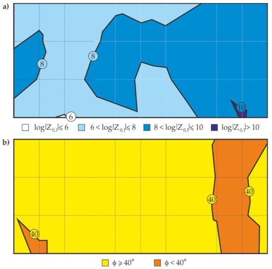 Similarly to the thickness measurements by the electromagnetic method, Figure 12a shows the maps of distribution of the logarithm of impedance modulus Z0.1, and Figure 12b presents the maps of distribution of phase-shift angle φ0.1, determined at the test points with reference to their location (nine columns and four rows).