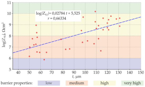 The calculated results are presented in Table 5. Relative percentage change against the value directly measured with the EIS is given in brackets at each calculated value of the logarithm of the impedance modulus. With reference to Table 3 presenting the measured logarithms of the impedance moduli, the number expressed in (%) at the calculated values of log|Z0,1| in Table 5 means lower value (−) or higher value (+). A difference between the measured and calculated logarithm of the impedance moduli did not exceed 10% for as many as 22 test points. For seven tests points, the calculated log|Z0,1| changed a class of barrier properties defined in Table 1. With reference to the measured values, the barrier properties determined from the correlation relationships were lower by one class in five cases (yellow cells in Table 5), and in two cases they were higher (blue cells in Table 5).