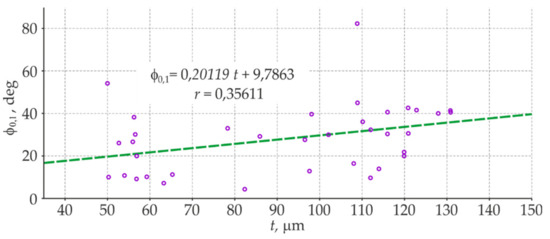 Figure 14 presents the correlations between the thickness t of the blue coating determined by the electromagnetic method and the phase-shift angle φ0.1 determined by the EIS method. The obtained estimate of the correlation coefficient r = 0.356 indicated the low correlation and only clear relationship between the thickness of the coatings and the angles of phase shift. The insignificant level of the correlation excluded the phase-shift angle as the second parameter, which could be potentially taken into account in the methodology for testing barrier properties of large non-conductive anti-corrosion coatings applied to steel structures.