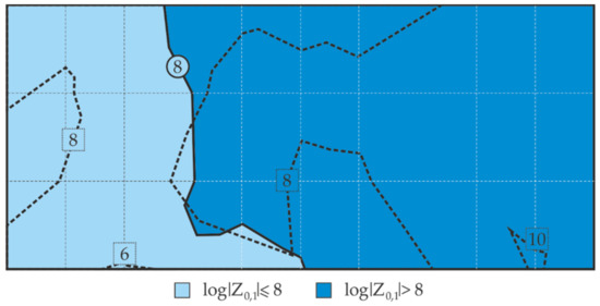 Differences between calculated and measured barrier properties of the examined coating are shown in the contour line map of the distribution of the impedance modulus logarithm in Figure 16. The analysis of this map in Figure 16 indicated that only two areas determined from the calculated logarithms of impedance moduli Z0.1 had moderate and high barrier properties in accordance with the criteria specified in Table 1. Boundary lines of the areas determined by the indirect measurements with the EIS were marked on the contour line map with a black broken line for comparative purposes (cf. Figure 12a). There is an evident convergence of the localization of the areas with the same barrier properties and the path of the boundary lines between these areas. Hence, it can be concluded that the distribution of the barrier properties determined from the calculated values generally did not change with reference to the measured values. This could indicate that the proposed methodology is applicable to technical evaluation of barrier properties of paint coatings in non-destructive in situ tests conducted on large steel structures.