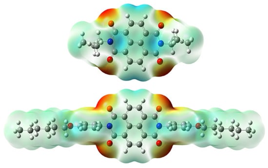 Figure 2 presents the mapped molecular electrostatic potential surface, illustrating the electrostatic potential of the rich and poor electron cloud in the molecule. The red color represents the most negative, whereas blue is the most positive parts of the molecule. Other spectral colors represent intermediate values. The color code of the maps is in the range between −3.88 × 10−2 a.u. (deepest red) and 3.88 × 10−2 a.u. (deepest blue) for NDI-s-Bu and −5.27 × 10−2 a.u. (deepest red) to 5.27 × 10−2 a.u. (deepest blue) for NDI-4-n-OHePh. For NDI-s-Bu, the red regions in the cloud are located around the carbonyl groups, whereas the blue color is found around the imide heterorings and aromatic rings of the core. A similar color distribution is found in the case of NDI-4-n-OHePh; one should, however, note distinct blue color around the alkoxy oxygen extending to the aromatic ring. The distribution of the electron cloud confirms the more pronounced donor/acceptor character of NDI-4-n-OHePh as compared to NDI-s-Bu, caused by weakly electron-donating alkoxy substituents.