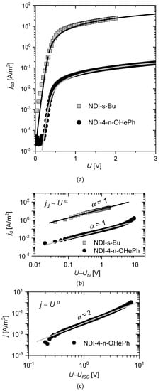 The current–voltage characteristics for the tested samples shown in Figure 3b are linear in the voltage range from 0.7 V to 2 V for NDI-s-Bu and from 0.9 V to 2.8 V for NDI-4-n-OHePh. This means that for voltages higher than Ubi, the model assumptions given by Equation (3), are still valid. This compatibility of the experiment with the model also proves that the phenomenon of mobility enhancement due to the density of states filling [40,41] can be neglected, and, as a result, the mobility of charge carriers remains constant.