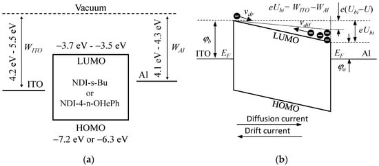 From the mutual relations between the LUMO levels and the work function of the electrode shown in Figure 4b, it follows that the built-in field voltage is Ubi = (φb − φa)/e; then, Equation (6) can be written as: