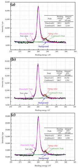 The spectra of carbon 1s by XPS and its fitting curves are exhibited in Figure 2. According to the NIST data [18], 284.8 eV and 288.2 eV are the binding energies of dissolved carbon atoms and compound carbon atoms, respectively. For this experiment, the binding energies of dissolved carbon atoms and compound carbon atoms were about 285.0 eV and 288.8 eV. The difference between the test results and the standard values lay in the subtle differences in the test environment and materials. It can be seen from Figure 2 that the C 1s peak spectra with different secondary cold reduction rates have similar peak shapes: the peak intensity of dissolved carbon atoms from low to high was A < B < C. In order to better compare the relative content of dissolved carbon atoms, the integral area of dissolved carbon peak was used for comparison; the integral area from low to high was A < B < C, which indirectly indicated that the content of dissolved carbon atoms in DR tinplate from low to high was A < B < C, but the content of compound carbon atom shows the opposite rule.