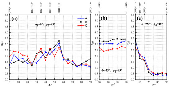 The texture distribution with different secondary cold reduction rates on the different oriented lines is exhibited in Figure 4. The difference in the RD orientation line was that the strongest point of texture for steel A and B was {111} <110>, but for steel C, they were three high extremum points, which are {112} <110>, {223} <110> and {111} <110>, respectively. At the same time, the intensity function value of near {001} <110> texture was also higher, and the value of {112} <110> texture increased with the increase in the secondary cold reduction rates [19]. The higher intensity RD fiber texture, especially {001} <110>, {112} <110> not only reduced the rm value of the material, but also promoted the earing direction of 45° [3]. On the ND orientation line, the intensity function value of {111} <112> for steel A and B was greater than that of {111} <110>, which made it easy to produce ear on the rolling direction of 0°/60°. However, the {111} texture for steel C was difficult to produce ear on the rolling direction of 0°/60° because {111} <112> was continuously transformed into {111} <110> with the increase in the secondary cold reduction rate. On the TD orientation line, the texture distribution of different secondary cold reduction rates was similar, and the intensity function value decreased rapidly with the increase in ϕ. However, both {554} <225> and {332} <113> had certain strength function values, which would produce ear on the rolling direction of 0°/60° and 30°/90°, respectively. This could balance ear on the rolling direction of 45° and reduce the earing coefficient.