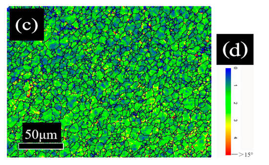 The local misorientation can be used to analyze the misorientation change in the grain of the plastic deformation metal, which is related to the dislocation density of the material, so it can indirectly reflect the relative strength of the residual stress [13]; that is, it can indirectly reflect the change of the secondary cold reduction rate. Figure 6 shows the local misorientation distribution with different secondary cold reduction rates, the closer the color was to red, the larger the grain misorientation was; the maximum misorientation is 15°. The blue region decreased with the increase in the secondary cold reduction rate. When the secondary cold reduction rate reached 25%, the color of some grains reached red, as shown in Figure 6c, implying an increase in the substructure or the dislocation density.