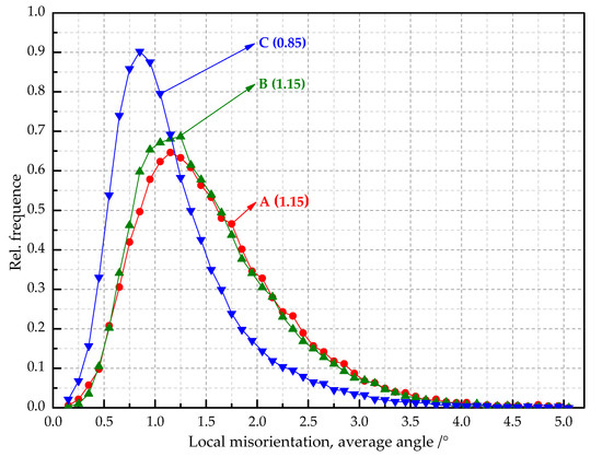 In order to show the difference in local misorientation, the distribution curves of local misorientation with different secondary cold reduction rates were shown in Figure 7. The distribution curves were of unimodal distribution, and the values in the brackets represented the mean value of the local misorientation. With the increase in the secondary cold reduction rate, the peak value of local misorientation decreased, but the mean value increased. The mean values of steel B and steel C are similar: both are 1.15, because local holes and cracks appear in the microstructure (see Figure 1); part of the internal residual stress was released, so the change was very small.