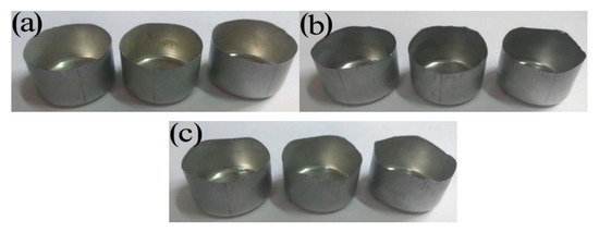 Experimentally drawn cups with different secondary cold reduction rates: (a) 15%; (b) 20%; (c) 25%.
