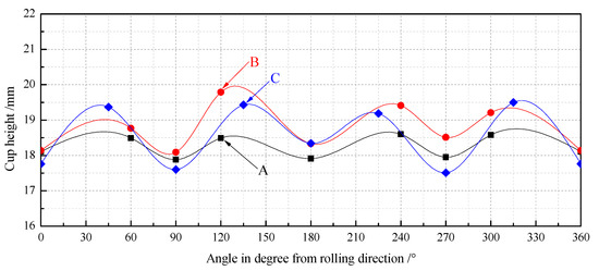 Figure 8 shows the experimentally drawn cups with different secondary cold reduction rates after the round pieces were punched. It is shown that the sample with a secondary cold reduction rate of 15% had small ears, and that of 20% and 25% had obvious ears with a certain angle to the rolling direction.
