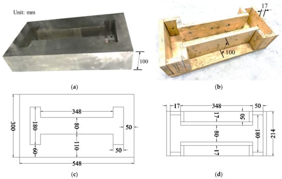 Invar, as a nickel–iron alloy, has a very low coefficient of thermal expansion and can maintain a fixed length in a wide temperature range. Taking Invar alloy as raw material, a relevant restraint device that meets the experimental conditions was designed and manufactured, as shown in Figure 1a, and the non-restrained specimen mold is shown in Figure 1b. The height of the concrete specimens was designed to be 100 mm, and the thickness of all wood panels was 17 mm. The specific dimensions of the top view of the restrained device and mold are shown in Figure 1c,d, respectively. The restrained and non-restrained specimens were poured according to the designed mix proportion.