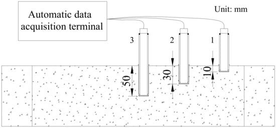 The plastic tubes for placing the sensor with an outer diameter of 20 mm were prepared. Two segments of a 3 mm-wide unconnected annular belt along the outer ring line 2 mm away from the bottom of the tube were cut, and the bottom of the plastic tube was sealed with a plastic sheet. The stainless steel bars with a diameter of 18 mm were prepared and placed in the plastic pipe in advance, and the inner wall of the plastic pipe was kept in close contact with the steel bar. The length of the steel bar exceeded the upper end of the plastic pipe by at least 5 cm for easy removal. The purpose was to ensure that the cement slurry did not penetrate from the bottom hole during the vibration process. The length of the sensor probe was 3 cm, and two O-shaped rubber sealing rings were sleeved at the position of 3 cm. Then, the mixed concrete was poured into the mold and fully vibrated with a vibrating bar. Finally, the plastic tube with a steel bar was slowly inserted into the corresponding position of the concrete specimen. According to the above steps, three plastic pipes were inserted into each concrete specimen, and their depths in the concrete were 1 cm, 3 cm and 5 cm, as shown in Figure 3.