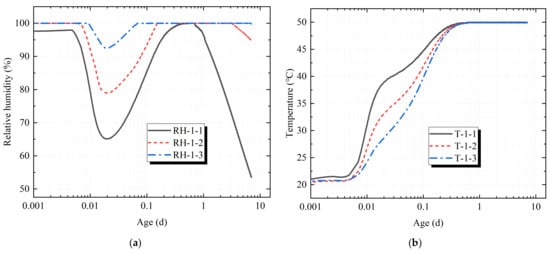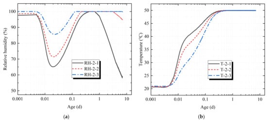 In order to distinguish the temperature and humidity collected by the sensors, the sensor numbered 1 for each specimen was named as temperature sensor T-1-1 and humidity sensor RH-1-1 in this paper, and the sensors numbered 2 and 3 were also named in this way. It can be seen in Figure 5 and Figure 6 that the temperature set in the test chamber was 50 °C, and the concrete specimen placed in the test chamber just after pouring was affected by its own cement hydration heat release and higher ambient temperature. The concrete temperature response rate measured by the temperature sensors T-1-1, T-1-2, T-1-3, T-2-1, T-2-2 and T-2-3 was faster at the start time of the test chamber. The depth of T-1-1 and T-2-1 was the closest to the surface of the concrete, and the response rate was the fastest. Sensors T-1-2 and T-2-2 took second place, and sensors T-1-3 and T-2-3 were the slowest with the increase in the hole depth. The temperature measured by sensor T-1-3 fluctuated to a certain extent around the 0.6th day of the loading age, but the temperature eventually rose rapidly to 50 °C and then remained stable.