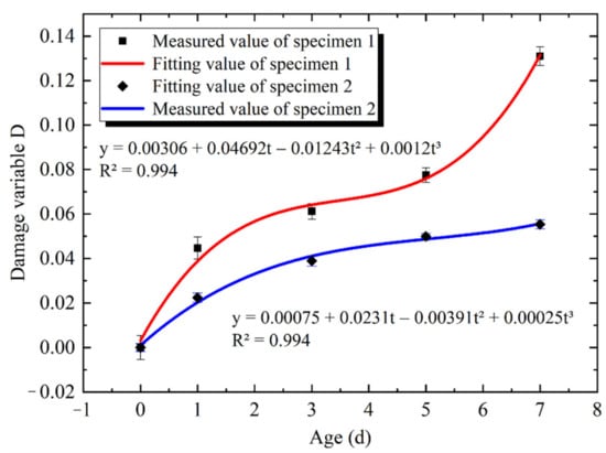 The relationship between the damage degree D and the loading age t (d) of specimens 1 and 2 was fitted by a cubic curve model [36]. The quantitative relationship between the damage degree D and the loading age t (d) was obtained, as shown in Equations (2) and (3). The comparison between the damage degree D and the loading age t (d) is shown in Figure 7. The details are as follows: