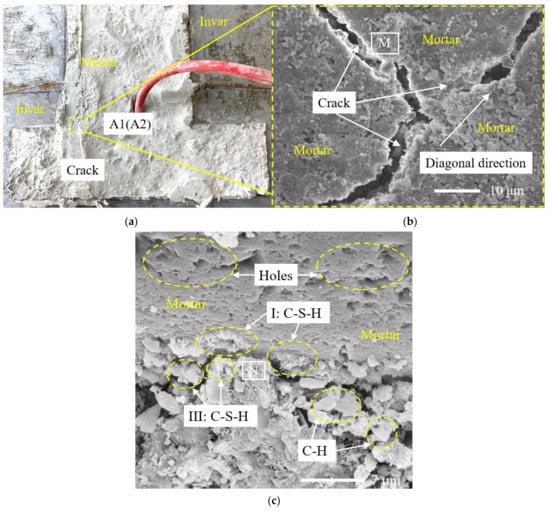 It can be seen in Chapter 3.1 that when the ambient temperature was 50 °C and the relative humidity was 30%, the relative humidity measured by the sensors RH-1-3 and RH-2-3, whose position depth was 30 mm from the upper surface, was close to 100% on the 7th day of the loading age. In order to make the results more obvious, samples A1 and A2 of specimen 1 (the position depth was 10 mm and 30 mm from the upper surface, respectively, and the specific position is shown in Figure 8a) were selected and observed by SEM microscopic morphology. Samples B1 and B2 of specimen 2 (the position depth was 10 mm and 30 mm from the upper surface, respectively, and the specific position is shown in Figure 9a) were also selected and observed by SEM microscopic morphology.