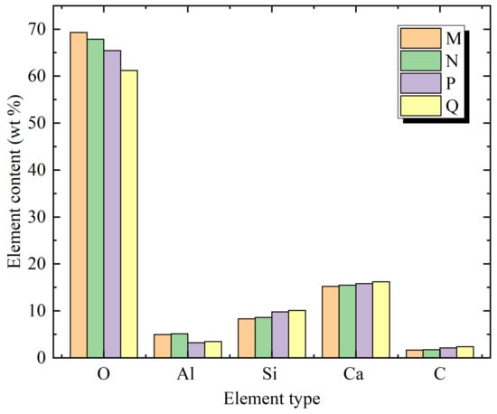 It can be seen in Figure 10 that for samples B1 and B2, the hydration products of regions P and Q were composed of O, Al, Ca, Si and C elements on the 7th day of the loading age. Except for the O element in region P being greater than that in region Q, other elements in region P were less than those in region Q. It can be inferred that there were hydration products such as C-S-H, CH, SiO2, Al2O3 and CaCO3. The Ca/Si ratios of P and Q were 1.62 and 1.61, respectively, which were slightly larger than 1.5. The crystallization degree was high, and the structural density was good. The Ca/Si ratio of region Q was 1.61, which was slightly smaller than that of region P, which was 1.62, indicating that the crystallization degree of region Q was slightly higher than that of region P.