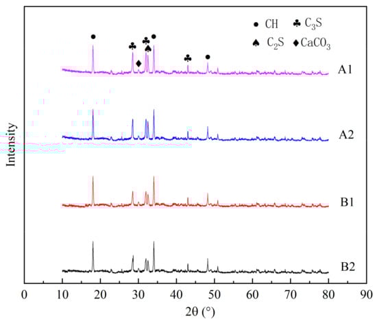For samples A1, A2, B1 and B2, there were characteristic peaks of CH at 18.06θ, 34.06θ and 48.22θ, characteristic peaks of C3S at 28.5θ and 31.98θ, characteristic peaks of C2S at 32.5θ and characteristic peaks of CaCO3 at 30.02θ. Comparing the characteristic peaks of CH and CaCO3 of the four samples, the difference was relatively small, but the characteristic peaks of C3S and C2S of the A1 and A2 samples were higher than those of the B1 and B2 samples, respectively, and the difference was relatively obvious, indicating that the A1 and A2 samples contained more unhydrated cement clinker minerals, namely, C3S and C2S, which also shows that the hydration reaction effect of the A1 and A2 samples was not as good as that of the B1 and B2 samples, which is consistent with the results of the previous analysis.