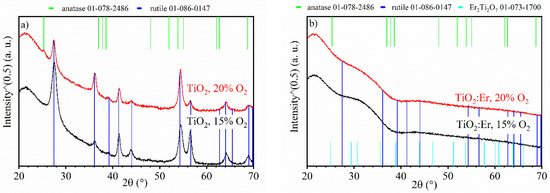 XRD patterns recorded for the thin films of: (a) pure TiO2 deposited at 15% O2 (black curve) and 20% O2 (red curve) and (b) Er-doped TiO2 deposited at 15% O2 (black curve) and 20% O2 (red curve). Positions of reference peaks are marked by vertical lines. Reference patterns are from anatase 01-078-2486, rutile 01-086-0147 and Er2Ti2O7 01-073-1700 cards.
