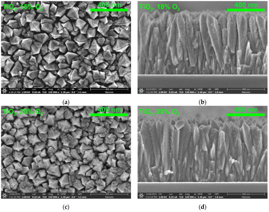SEM images of the surface and cross-section of undoped TiO2 thin films deposited at (a,b) 15% O2 and (c,d) 20% O2.