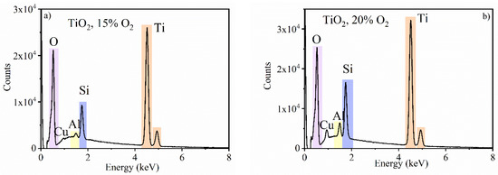 The grain analysis based on SEM images presented in Figure 2 and Figure 3 was carried out. The details concerning the distribution of the grain size can be found in the Supplementary Materials (Table S1). The average grain size of undoped TiO2 thin films is about 90–95 nm and does not depend on the oxygen concentration during sputtering. The average grain size of TiO2:Er films deposited at 15% O2 is about 14 nm and increases slightly to 19 nm for 20% O2.