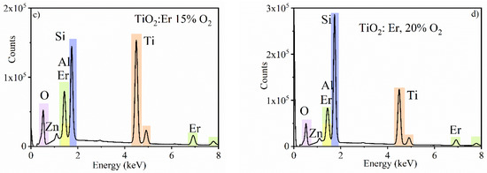 EDS analysis of TiO2 thin films: undoped TiO2 deposited at: (a) 15% O2 and (b) 20% O2; and TiO2:Er deposited at: (c) 15% O2 and (d) 20% O2.