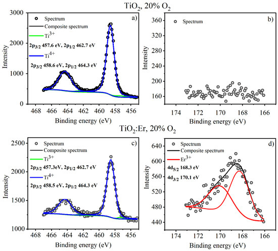 The XPS spectra of pure and Er-doped TiO2, deposited at 20% O2, are shown in Figure 6 within a region of binding energies covering Ti 2p (Figure 6a,c) and Er 4d peaks (Figure 6b,d). The Ti 2p spectrum was fitted with two 2p doublet structures (p3/2–p1/2 doublet separation equals 5.2 eV for Ti3+ state and 5.7 eV for the Ti4+ state) originating from two different states of Ti, which indicates the presence of nonstoichiometric titanium dioxide. Titanium is found mainly in Ti4+, which appears as a 2p3/2 line centered at 458.6 eV, but there is also a low concentration of Ti3+ oxidation state, which is expressed with 2p3/2 line at 457.3 eV [34].