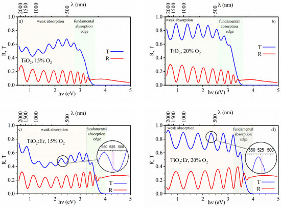 Spectral dependence of the transmittance T and reflectance R coefficients of thin films: undoped TiO2 (a) 15% O2 and (b) 20% O2; TiO2:Er (c) 15% O2 and (d) 20% O2. Additional absorption features zoomed-in circles.