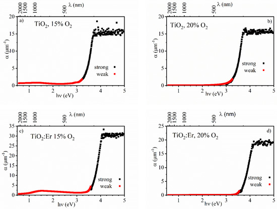 Spectral dependence of the absorption coefficient α of thin films: undoped TiO2 (a) 15% O2 and (b) 20% O2, and TiO2:Er (c) 15% O2 and (d) 20% O2.