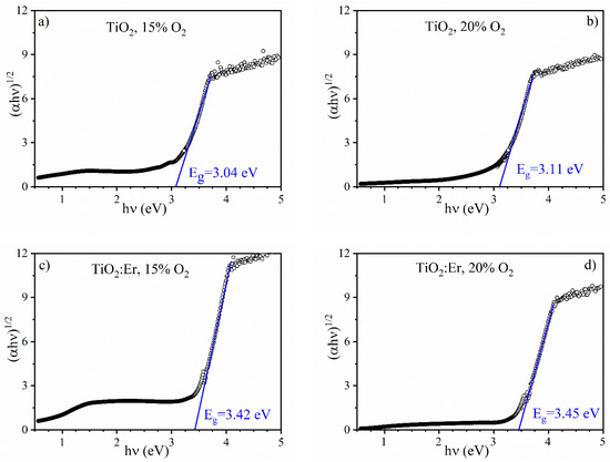 Band gap Eg determination for thin films—spectral dependence of the (αhν)1/2 coefficient vs. photon energy hν: undoped TiO2 (a) 15% O2 and (b) 20% O2; TiO2:Er (c) 15% O2 and (d) 20% O2.