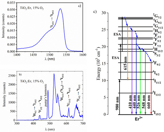 However, it is worth noting that the high concentration of Er ions induces the complex CR processes where energy transfer within the TiO2 band gap may not be excluded. When analyzing this aspect, the samples were excited at 488 nm, which led to the direct excitation of 4F7/2 erbium energy level and also corresponded to the sub-band excitation in TiO2. Under these conditions, the luminescence spectrum was registered within the wavelength range of 500–1100 nm, including undoped TiO2 samples for comparison (Figure 11a). When analyzing the erbium emission spectrum in both cases (15% and 20% O2), the characteristic intense transitions of 2H11/2 (4S3/2) → 4I15/2 and 4F9/2 → 4I15/2, assigned to the emission in the green (525 nm, 550 nm) and red (660 nm) part of the spectrum, were observed (Figure 11b). Moreover, in the NIR range, the luminescent bands at the wavelength of 800 nm (4I9/2 → 4I15/2), 850 nm (4S3/2 → 4I13/2) and much weaker at 980 nm (4I11/2 → 4I15/2) were recorded. By analyzing the spectra of undoped TiO2 thin films, the presence of bands in the range of 500–550 nm (2.48–2.25 eV, max. intensity 530 nm–2.5 eV), 580–725 nm (2.14 eV–1.7 eV), 840 nm (1.48 eV), 990 nm (1.25 eV) and 1050 nm (1.18 eV) was revealed. Green and red emissions are usually associated with the presence of oxygen vacancies and Ti3+ defects, respectively [46,47]. Oxygen vacancies can be located in a wide range of states (mid-gap), i.e., 2.269 eV (447 nm) to 2.719 eV (456 nm). However, in this case, radiation transitions from the TiO2 conduction band would have to take place, which is relatively unlikely, taking into account the 488 nm excitation. On the other hand, the visible luminescence (500–530 nm) may originate from the Ti3+ energy transfer to the surface oxygen vacancies [46,48]. The next two bands, i.e., at 840 nm and 990 nm, are related in particular to the emission in rutile TiO2 and the occurrence of self-interstitial defects of Ti4+ (Ti3+) [49].