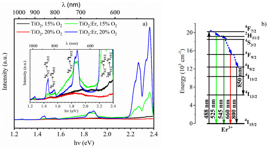 (a) Luminescence spectrum of pure TiO2 and Er-doped TiO2 thin films deposited at 15 and 20% of O2 (enlargement in the inset) excited with 488 nm laser; (b) simplified diagram of possible transitions in Er3+.