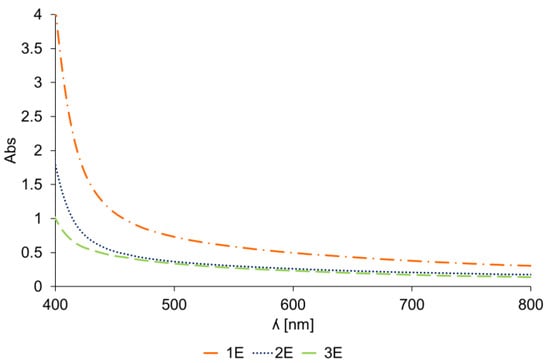 All the investigated solutions show pH values around 5 indicating the acidic range. 1st extraction (1E) shows pH 5.4 at 21.3 °C, 2nd extraction (2E) shows pH 5.5 at 20.6 °C and 3rd extraction (3E) shows pH 5.6 at 22.9 °C. Acidic dye solutions are most often anionic in nature and are suitable for the dyeing of protein fibers and polyamide as well [26,27].