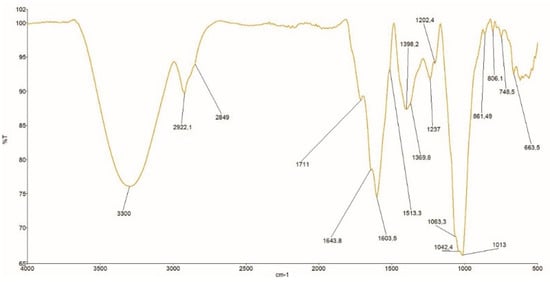 - 1399−1200: associated with C–OH deformations vibrations of phenols (1398 cm−1 and 1369 cm−1) and C–O stretching vibrations of aromatic ethers in phenols (1237 cm−1) and C–O stretching band due to pyranose structure (1202 cm−1) [38];