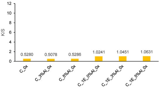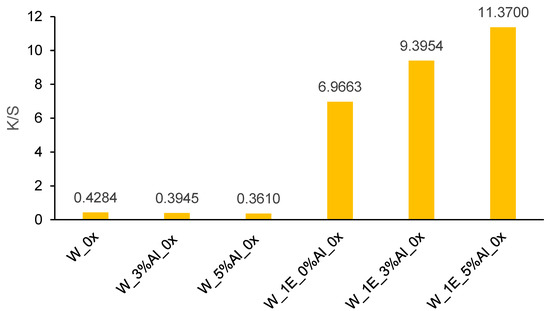 K/S values of cotton and wool fabrics are presented in Figure 6 and Figure 7. Figure 6 shows the effect of different mordant concentrations on dyed and undyed cotton fabrics. It is also visible that different aluminum mordant concentration does not significantly affect the K/S value. Vankar, P.S. et al. [31] stressed out that alkaline pH allows the strongest affinity of Al3+ metal to natural dye than acidic pH. Consequently, such low color strength is due to poor metal bonding with cellulose substrate and natural dye. Furthermore, Glogar, M.I. et al. presented in their paper [41] how the sample surface affects color strength as well. Smooth fabrics like cotton produce lower K/S compared to fabrics with a rougher surface (e.g., wool).