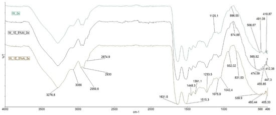 - 1199–700: assigned to C–O stretching vibrations (1063 and 1042 cm−1), C−OH stretching vibrations characteristic for flavanols, i.e., for quercetin (1013 cm−1) and out of plane CH deformation vibrations of the functional groups mainly from carbohydrates (region from 900 to 700 cm−1) [12,28,39,40].
