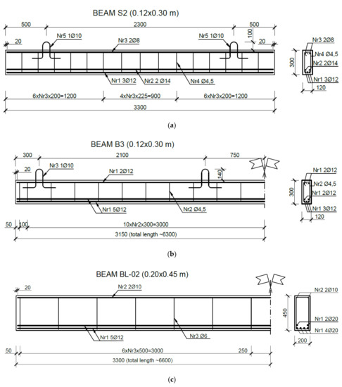 | Symbol | Dimension [m] | Longitudinal Reinforcement [mm] | Stirrups [mm/m] | Number of Elements [pcs] | Static Scheme | ||
