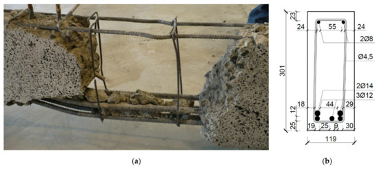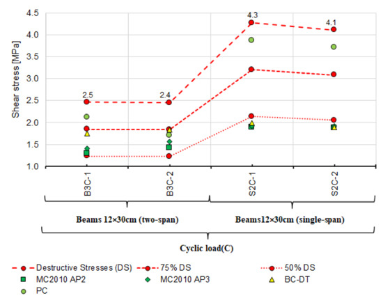 - the shear capacity of the RC beam support zone depends on the shear strength provided by the shear reinforcement and concrete (e.g., interlocking effect—MC2010 [3], dowel action—e.g., ACI [4,18]) during loading and after cracking. For this reason, it should be taken into account in shear capacity estimation.