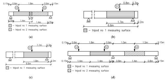 - for elements S2M and S2C, two tripods of the optical system allowed testing two beam support surfaces by creating overlapping measurement fields with dimensions 0.30 m × 1.40 m (Figure 9a),