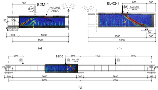- for BL-02M elements, due to loading with one concentrated force, the measurement field covered the support zone at the actuator with dimensions of 0.45 m × 1.70 m and 0.45 m × 1.80 m (Figure 9b,c),